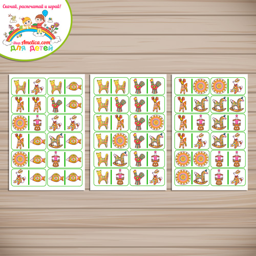 Распечатайте листы на картоне или плотной бумаге, заламинируйте и вырежьте фишки домино. Детское домино готово!