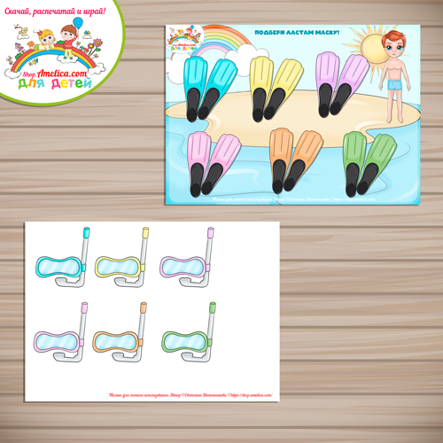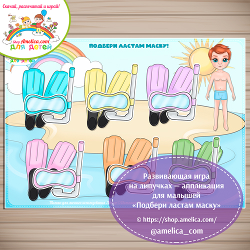 Игра на липучках — аппликация для малышей «Подбери маску к ластам» скачать для распечатки