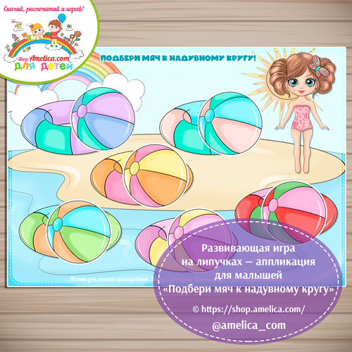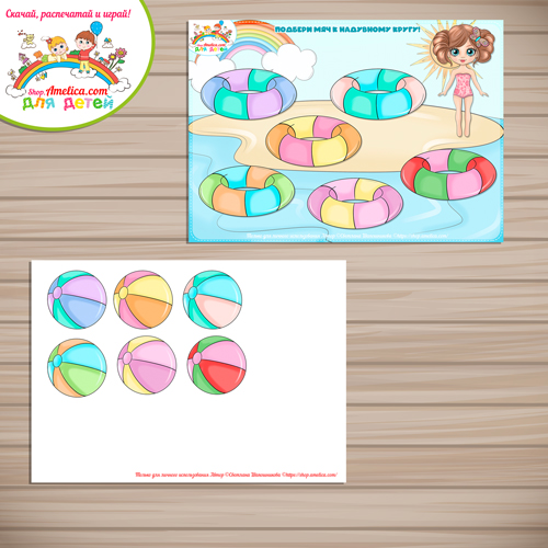 Игра на липучках — аппликация для малышей «Подбери мяч к надувному кругу» скачать для распечатки