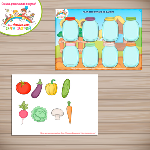 Игра на липучках — аппликация для малышей «Разложи соленья в банки» скачать для распечатки