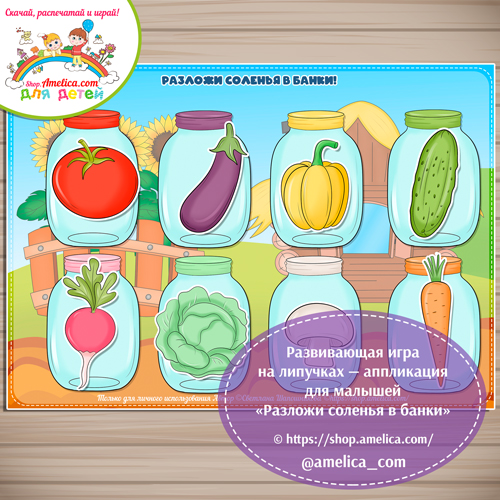 Игра на липучках — аппликация для малышей «Разложи соленья в банки»