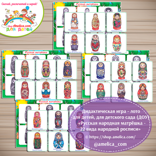 Дидактическая игра — лото для детей, для детского сада (ДОУ) «Русская народная матрёшка — 22 вида русской народной росписи».