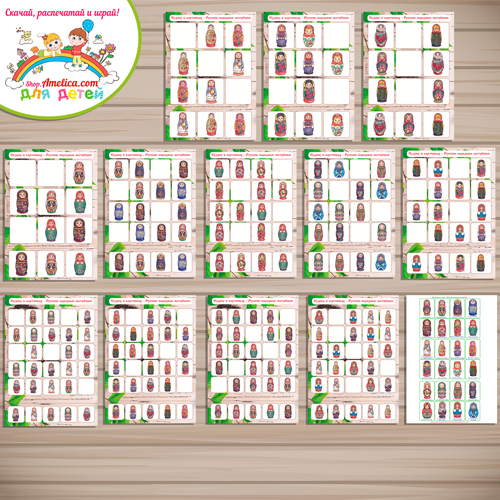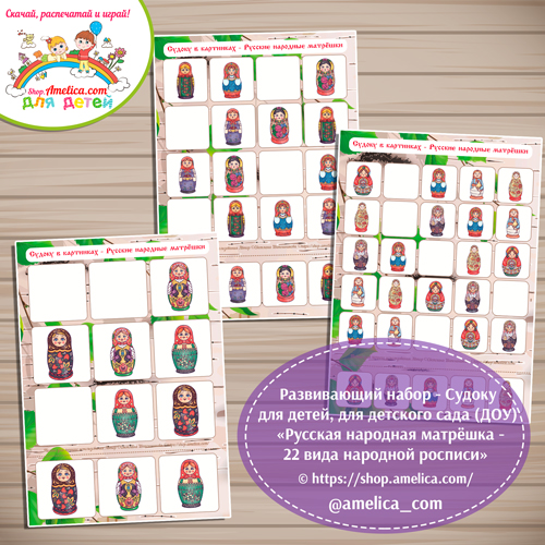 Развивающий набор — Судоку для детей, для детского сада (ДОУ) «Русская народная матрёшка — 22 вида русской народной росписи» шаблон скачать для печати
