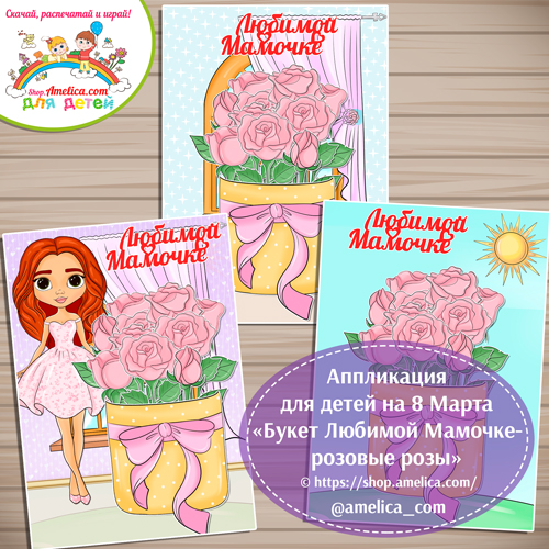 Аппликация для детей, открытка к 8 Марта «Букет Любимой Мамочке — розовые розы» для занятий дома или в детском саду.