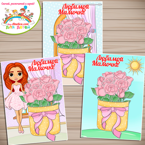Аппликация для детей, открытка для детского сада (ДОУ) к 8 Марта «Букет Любимой Мамочке — розовые розы» шаблон скачать для распечатки (Копировать)