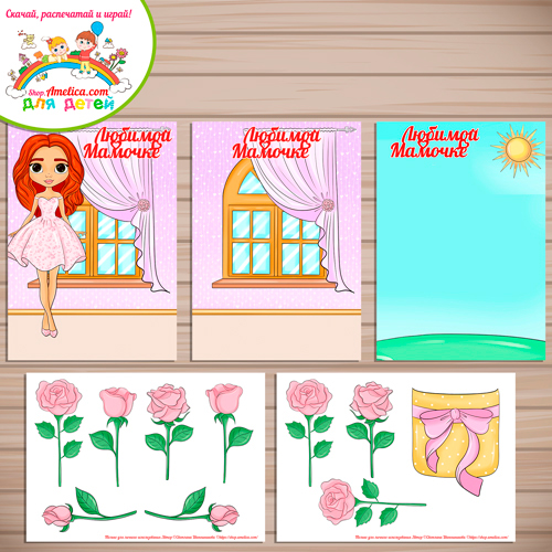 В наборе 5 листов в формате А4: фон в 3 вариантах на выбор, и 2 листа с элементами аппликации.