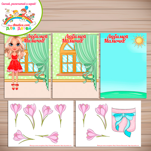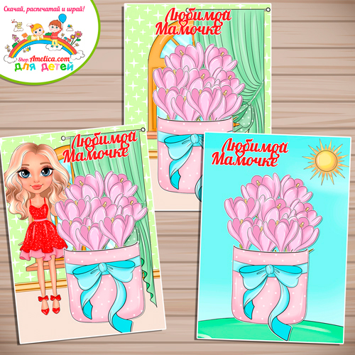 Аппликация для детей, открытка для детского сада (ДОУ) к 8 Марта «Букет Любимой Мамочке — крокусы» шаблон скачать для распечатки