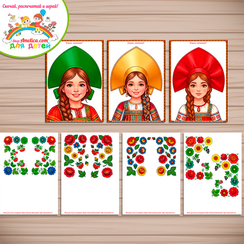 Набор на 7 листах аппликаций А4 для дошкольников: 3 фона формата А4 и варианты украшений для кокошника на 4 листах.