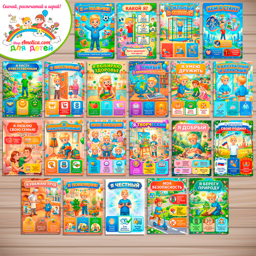 В наборе листы (плакаты): Обложка: Я — МАЛЬЧИК!, Какой я?, Мои интересы, Я сильный и смелый, Я помощник, Я умный и любознательный, Кем я стану, Я умею дружить, Мои эмоции, Я вежливый, Я аккуратный и опрятный, Моя безопасность, Я расту ответственным, Я выбираю здоровье, Я люблю свою семью, Я честный, Я самостоятельный, Я творческий, Я берегу природу, Я люблю свою Родину, Я уважаю труд, Я добрый.