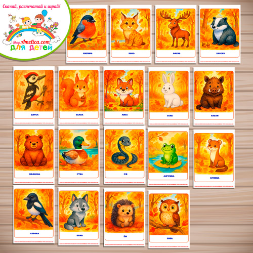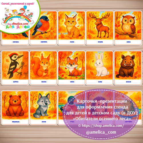 Демонстрационные карточки — презентации для оформления стенда для детского сада «Животные осеннего леса».
