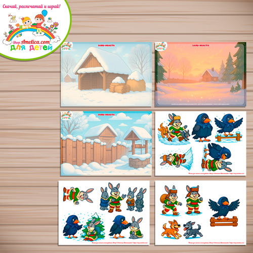 В наборе 3 фоновых изображения формата А4 и 3 листа со съемными элементами для игры на липучках.
