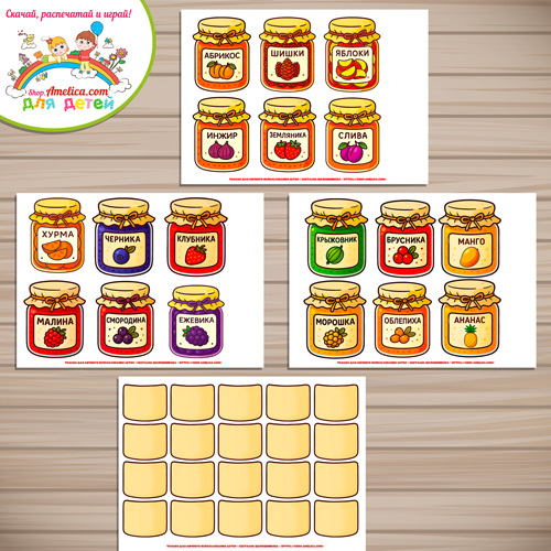 Распечатайте материалы игры на цветном принтере на обычной бумаге. Вырежьте и приклейте пустые этикетки на банки с вареньем. Все игра готова, можно начинать играть!