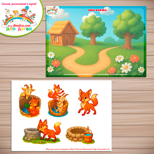 Почитайте ребенку сказку «Лиса и козёл» и положите рядом фон и всех героев. Малышу очень понравится такой «кукольный театр», ведь слушать сказку и играть намного интереснее!