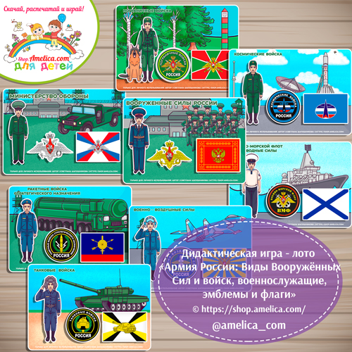 Дидактическая игра — лото «Армия России: Виды Вооружённых Сил и войск, военнослужащие, эмблемы и флаги» скачать для распечатки