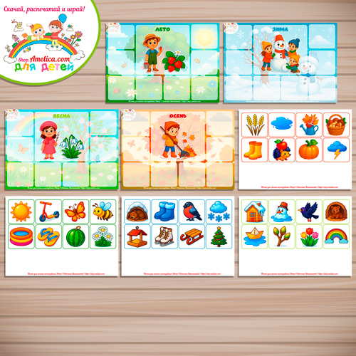 В наборе 4 игровых поля, а также 4 листа с карточками с картинками признаков времён года по 8 шт. на каждое время года.