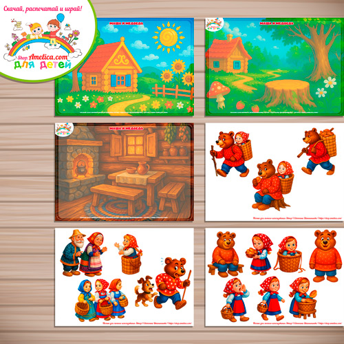 Почитайте ребенку сказку «Маша и медведь» и положите рядом фон и всех героев. Малышу очень понравится такой «кукольный театр», ведь слушать сказку и играть намного интереснее!