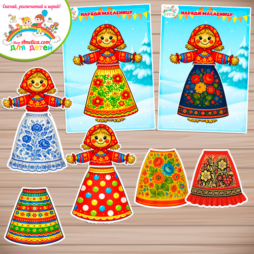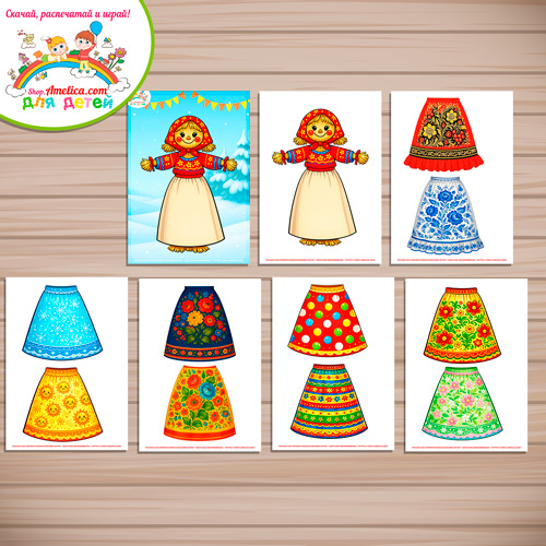 В состав игры входит кукла с фоном, кукла отдельно и 5 листов с юбками для масленицы.