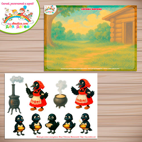 Почитайте ребенку сказку «Сорока-ворона» и положите рядом фон и всех героев. Малышу очень понравится такой «кукольный театр», ведь слушать сказку и играть намного интереснее!