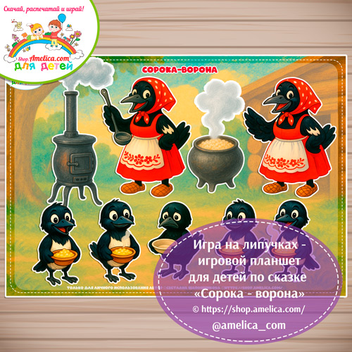 Дидактическая игра на липучках — игровой планшет для детей по сказке «Сорока-ворона» скачать шаблон для печати