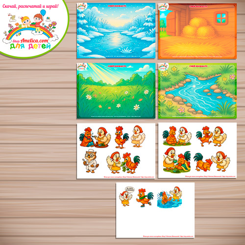 В наборе 4 фона на листе формата А4 и 4 листа со съемными элементами для игры на липучках — герои сказки.