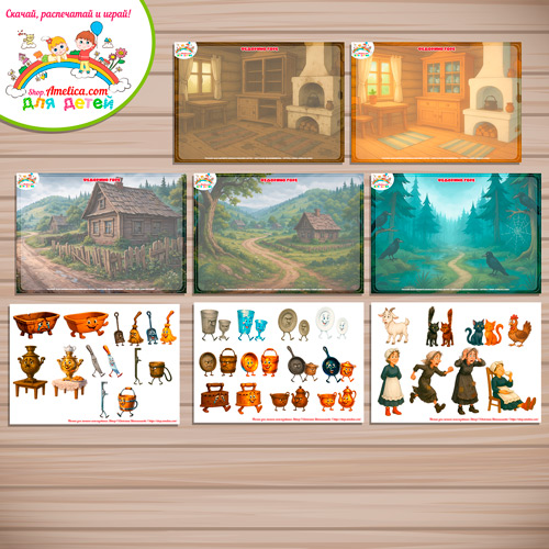 В наборе 5 фоновых изображений формата А4 и 3 листа со съемными элементами для игры на липучках.