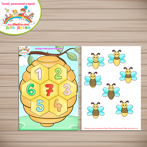 Математическая игра — аппликация для малышей «Найди пчёлке её домик» шаблон скачать для распечатки