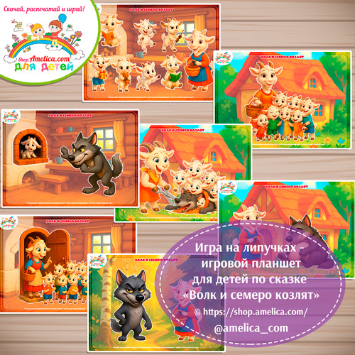 Дидактическая игра на липучках — игровой планшет для детей по сказке «Волк и семеро козлят»-2 вариант .