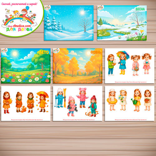В наборе 4 фона на листе формата А4 и 4 листа со съемными элементами для игры на липучках — мальчики по временам года.