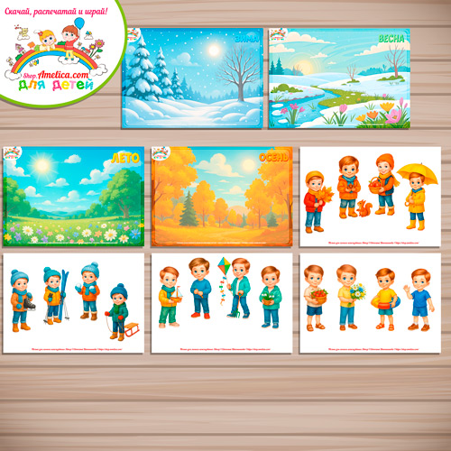 В наборе 4 фона на листе формата А4 и 4 листа со съемными элементами для игры на липучках — мальчики по временам года.