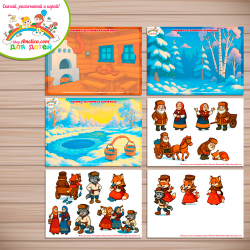 В наборе 3 фона на листе формата А4 и 3 листа со съемными элементами для игры на липучках — герои сказки.