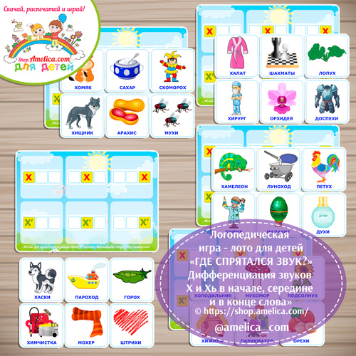 Логопедическая игра — лото для детей «ГДЕ СПРЯТАЛСЯ ЗВУК?» Дифференциация звуков Х и Хь в начале, середине и в конце слова».
