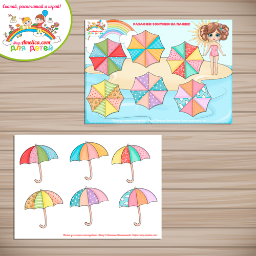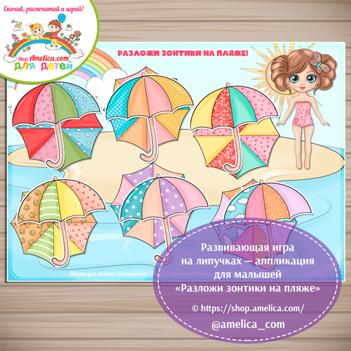 Игра на липучках — аппликация для малышей «Разложи зонтики на пляже» скачать для распечатки