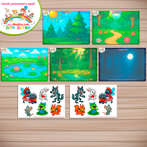 В наборе 4 фоновых изображения на листе формата А4 и 2 листа со съемными элементами для игры на липучках — герои сказки.