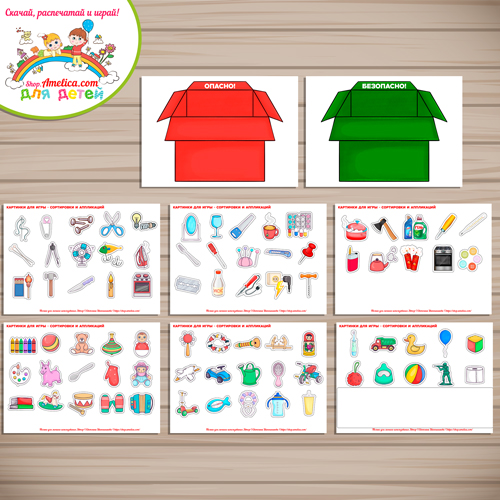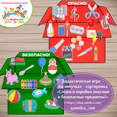 Дидактическая игра на липучках — сортировка или аппликация «Сложи в коробки опасные и безопасные предметы»
