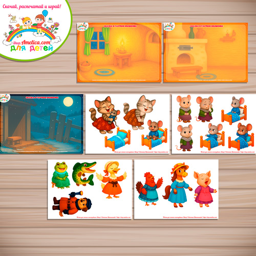В наборе 2 фон на листе формата А4 и 4 листа со съемными элементами для игры на липучках — герои сказки.