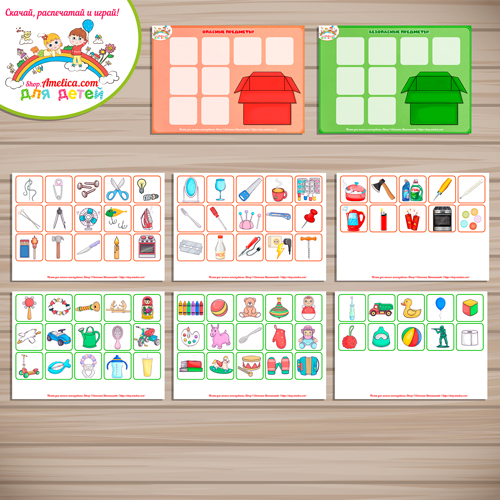 В наборе 2 фона на листах формата А4 и 80 карточек с цветными иллюстрациями, по 40 шт. на каждый признак.
