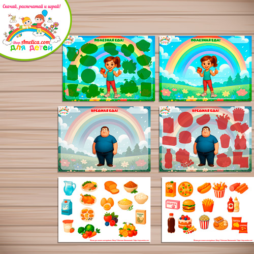 Дидактическая игра — сортировка на липучках для детей «Полезная и вредная еда» для дома или детского сада скачать для печати