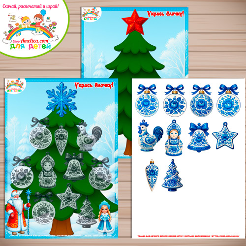 Новогодняя дидактическая игра на липучках «Укрась ёлочку — гжельская роспись» шаблон скачать для печати