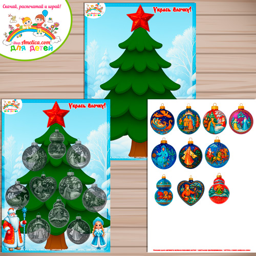 Новогодняя дидактическая игра на липучках «Укрась ёлочку — палехская роспись» шаблон скачать для печати