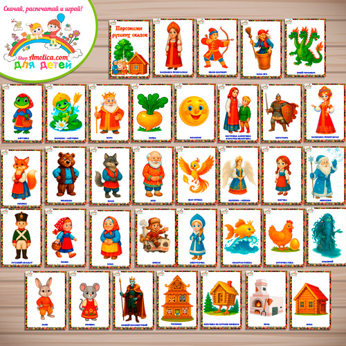 Данный набор содержит 35 карточек и обложка с иллюстрациями на тему — Герои русских сказок.