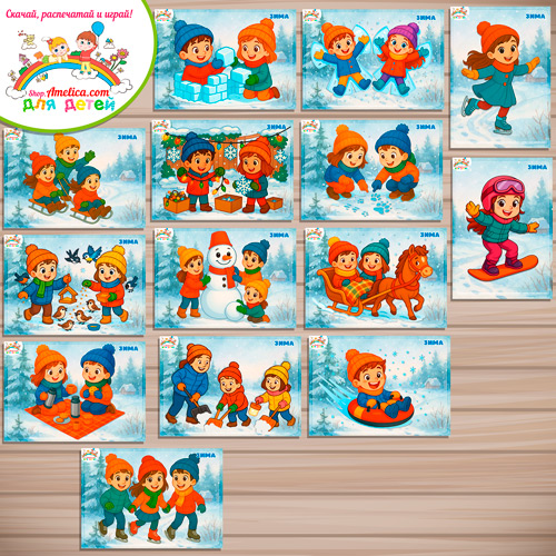 Карточки — презентация (наглядный материал) для дошкольников «Занятия детей зимой» -2 вариант скачать и распечатать