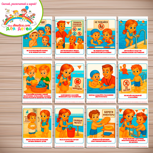 Демонстрационные карточки — презентации для детей, для детского сада «Правила поведения в бассейне» скачать для печати