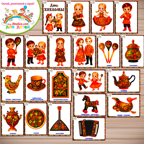 Данный набор содержит 20 карточек и обложка с иллюстрациями на тему — День Хохломы.