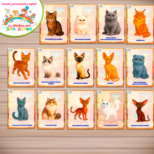 Карточки — презентации для детей, оформления стенда в детском саду «Породы кошек» — 1 вариант скачать для печати