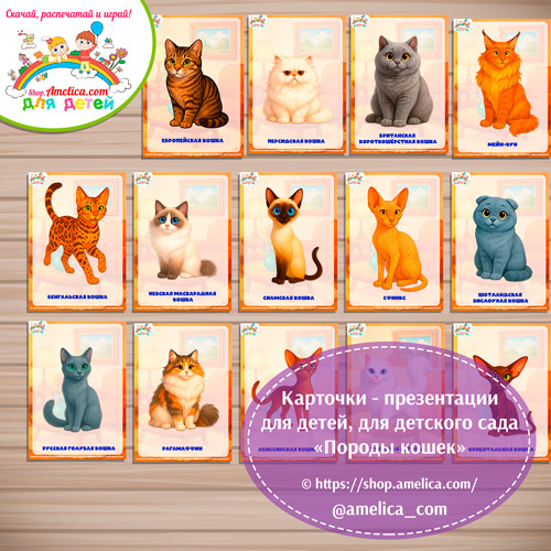 Карточки — презентации для детей, оформления стенда в детском саду «Породы кошек» — 1 вариант
