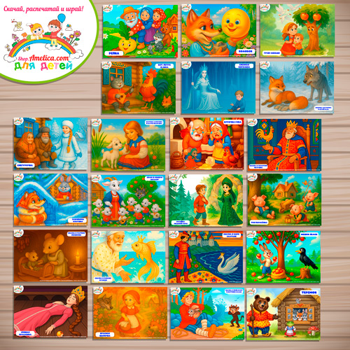 Данный набор содержит 22 карточки с иллюстрациями на тему — русские сказки.
