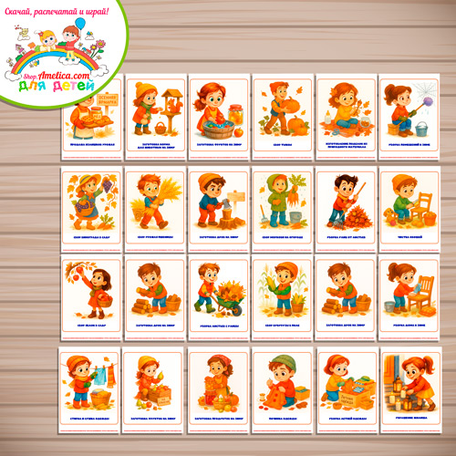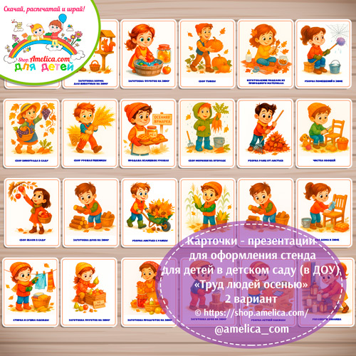 Демонстрационные карточки — презентации для оформления стенда для детского сада «Труд людей осенью» — 2 вариант скачать для печати