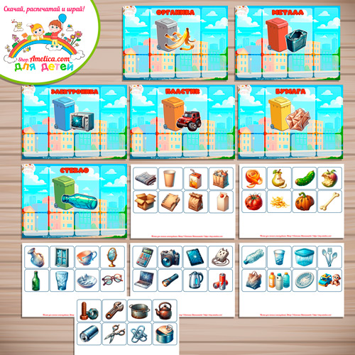 Набор состоит из 6 игровых полей и карточками с цветными объектами по 8 шт. на каждый мусор.