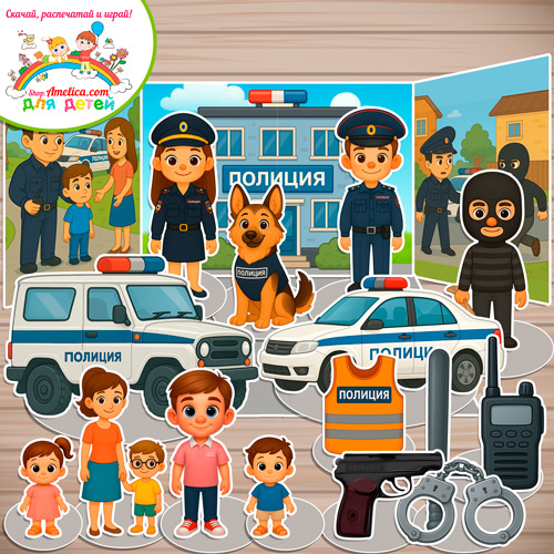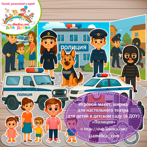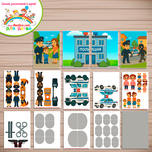 В наборе: игровой макет на 4 листах А4, двусторонние персонажи и предметы Полицейского на 6 листах А4, шаблоны для подставок под фигурки на 3 листах А4, фон для настольно театра.