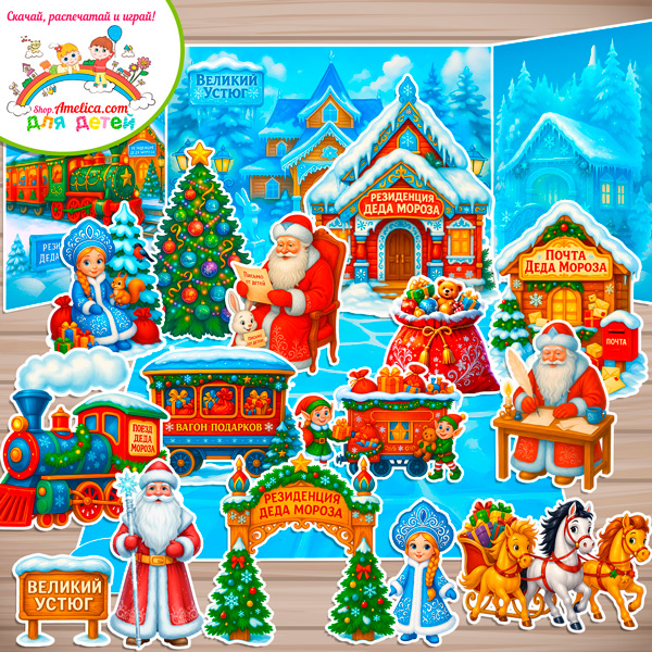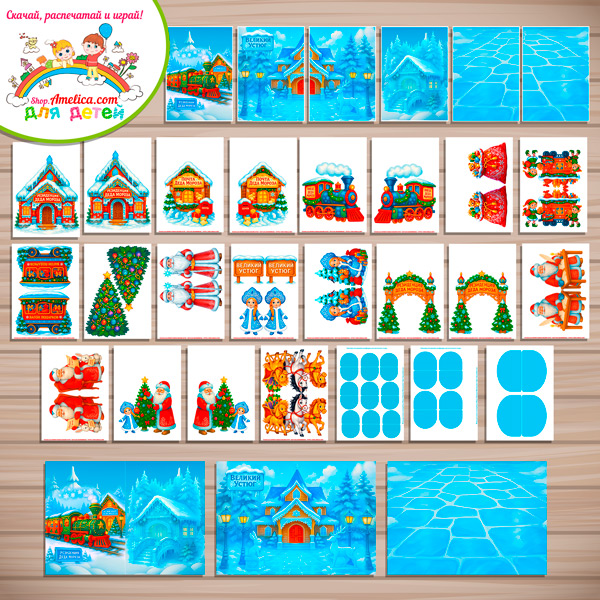В наборе: игровой макет на 4 листах А4, двусторонние персонажи и предметы резиденции на 20 листах А4, шаблоны для подставок под фигурки на 3 листах А4, фон для настольно театра.